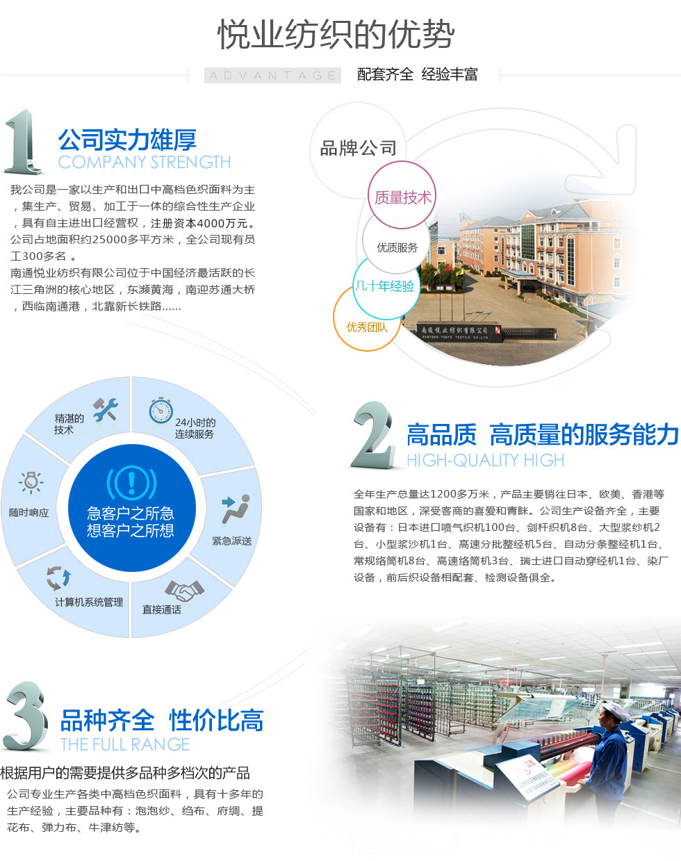南通悅業(yè)紡織有限公司位于中國(guó)經(jīng)濟(jì)最活躍的長(zhǎng)江三角洲的核心地區(qū)、中國(guó)近代第一城—江蘇省南通市,是一家以生產(chǎn)和出口中高檔色織布為主業(yè)的集生產(chǎn)、貿(mào)易、加工于一體的企業(yè),具有進(jìn)出口經(jīng)營(yíng)權(quán),注冊(cè)資本4000萬(wàn)元。 公司常年生產(chǎn)各類中高檔色織面料,品種有:全棉色織布,cvc、T/C、青年布...